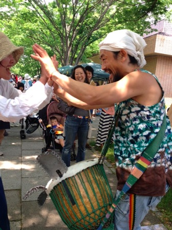 楽しさ、幸せ、熱い気持ちをまっすぐ伝えてくるジャンベ奏者。ギターと三線も弾いて、島唄歌ったり。